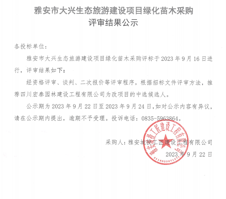 雅安市大興生態(tài)旅游建設(shè)項(xiàng)目綠化苗木采購(gòu)評(píng)審結(jié)果公示