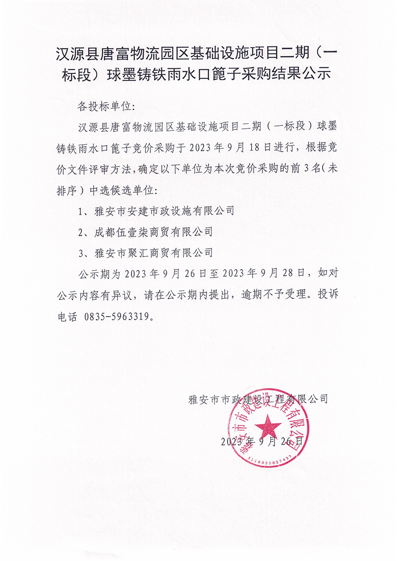 漢源縣唐富物流園區(qū)基礎(chǔ)設(shè)施項(xiàng)目二期(一標(biāo)段)球墨鑄鐵雨水口篦子采購結(jié)果公示