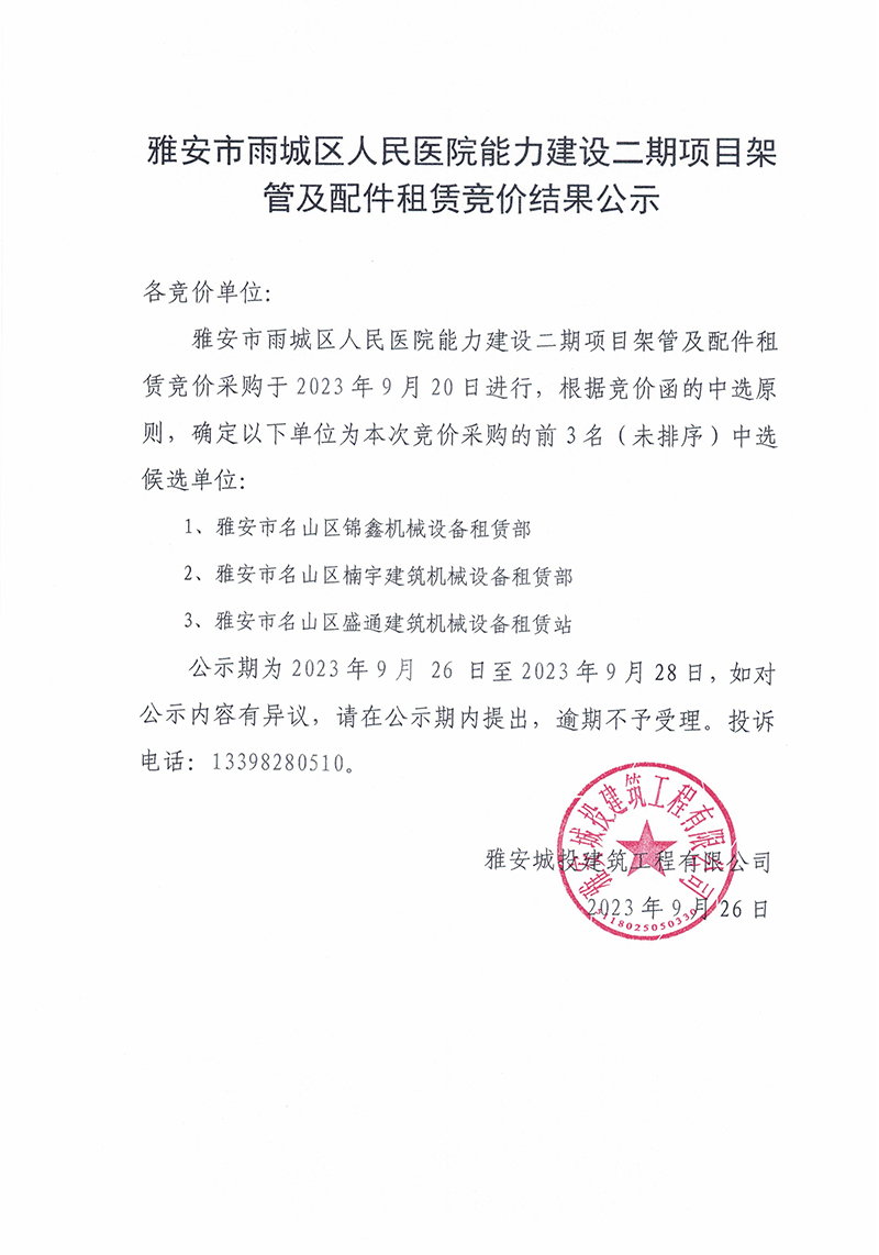 雅安市雨城區(qū)人民醫(yī)院能力建設(shè)二期項目架管及配件租賃競價結(jié)果公示