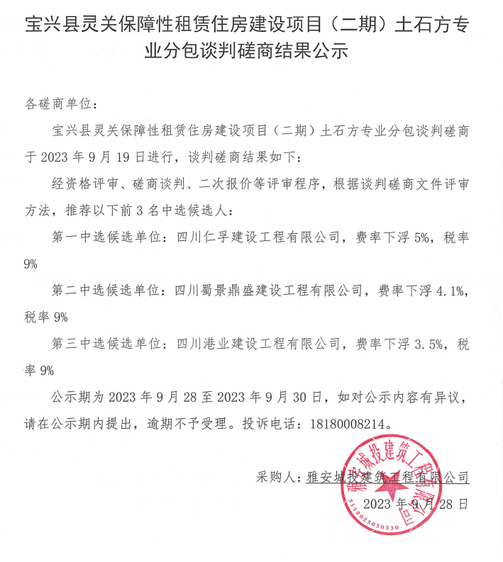 寶興縣靈關(guān)保障性租賃住房建設(shè)項(xiàng)目(二期)土石方專業(yè)分包談判磋商結(jié)果公示