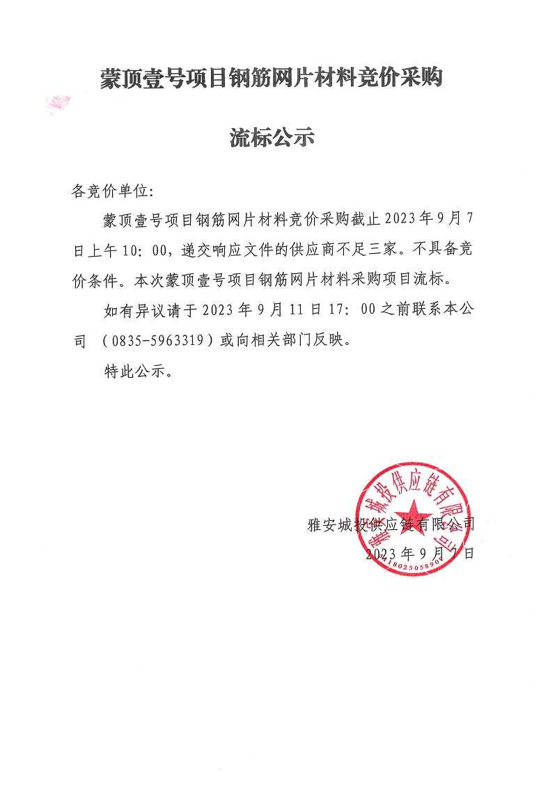 蒙頂壹號項(xiàng)目鋼筋網(wǎng)片材料競價(jià)采購流標(biāo)公示
