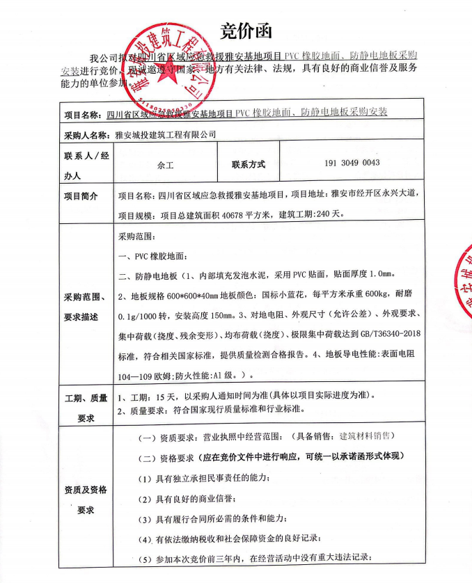 四川省區(qū)域應(yīng)急救援雅安基地項(xiàng)目PVC橡膠地面、防靜電地板采購安裝競價(jià)公告