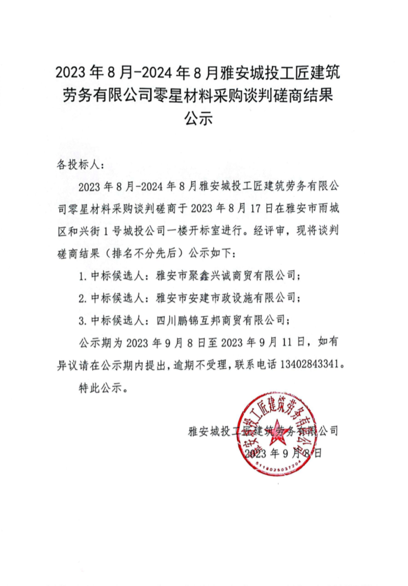 2023年8月-2024年8月雅安城投工匠建筑勞務(wù)有限公司零星材料采購談判磋商結(jié)果公示