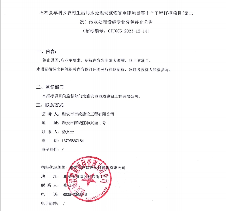 石棉縣草科鄉(xiāng)農(nóng)村生活污水處理設施恢復重建項目等十個工程打捆項目(第二次)污水處理設施專業(yè)分包終止公告