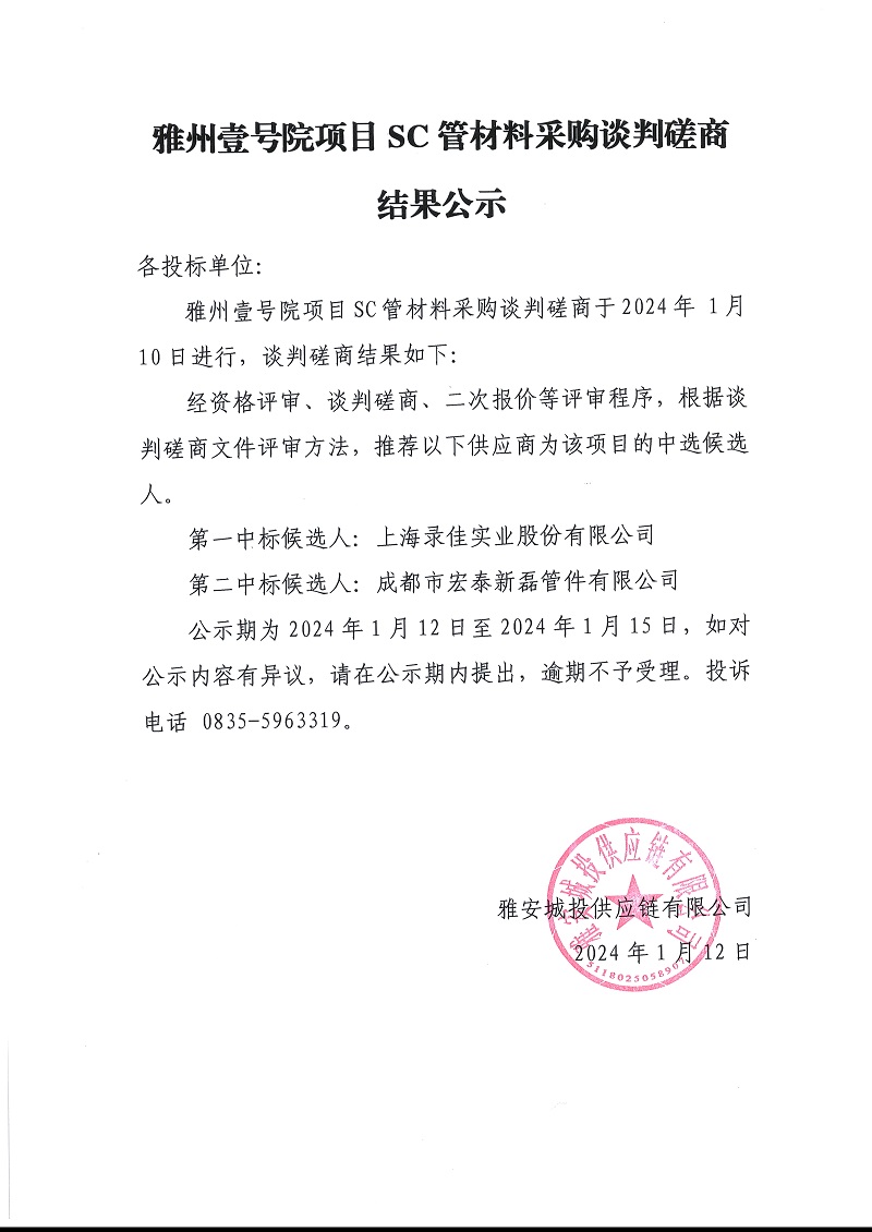雅州壹號院項目SC管材料采購談判磋商結(jié)果公示