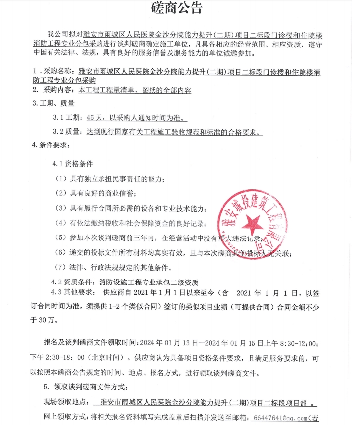 雅安雨城區(qū)人民醫(yī)院金沙分院能力提升(二期)項(xiàng)目二標(biāo)段門診樓和住院樓消防工程專業(yè)分包采購談判磋商公告