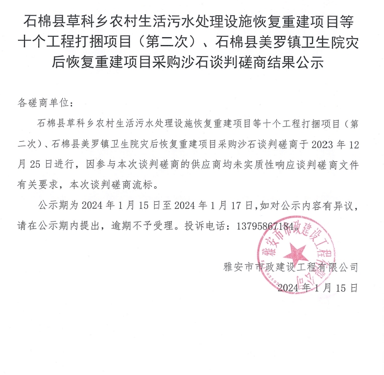 石棉縣草科鄉(xiāng)農(nóng)村生活污水處理設(shè)施恢復(fù)重建項目等十個工程打捆項目(第二次)、石棉縣美羅鎮(zhèn)衛(wèi)生院災(zāi)后恢復(fù)重建項目采購沙石談判磋商結(jié)果公示