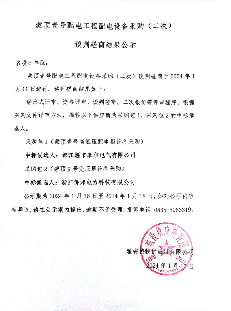 蒙頂壹號(hào)配電工程配電設(shè)備采購(gòu)(二次)談判磋商結(jié)果公示