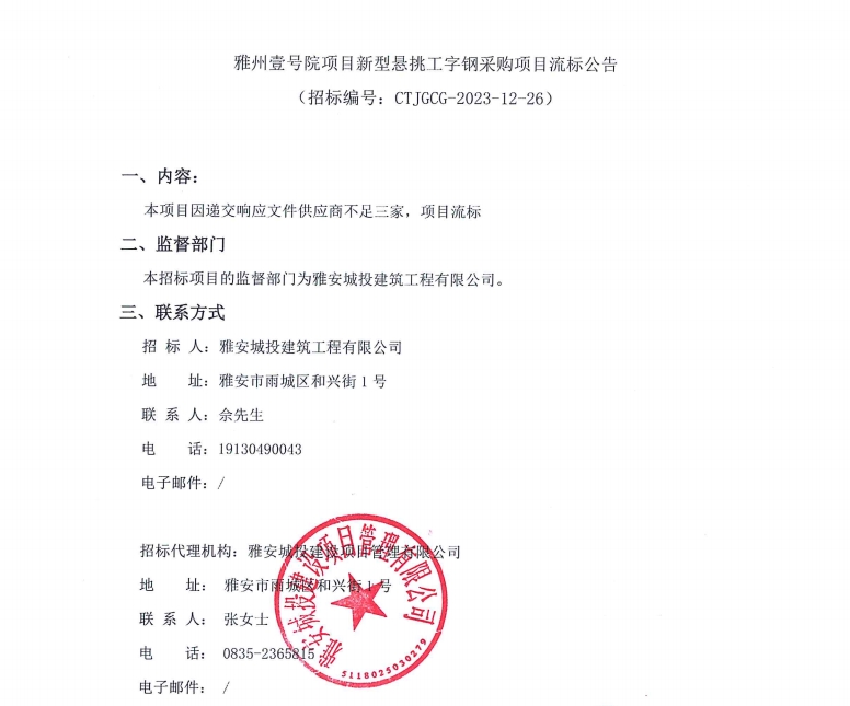 雅州壹號院項目新型懸挑工字鋼采購項目流標(biāo)公告