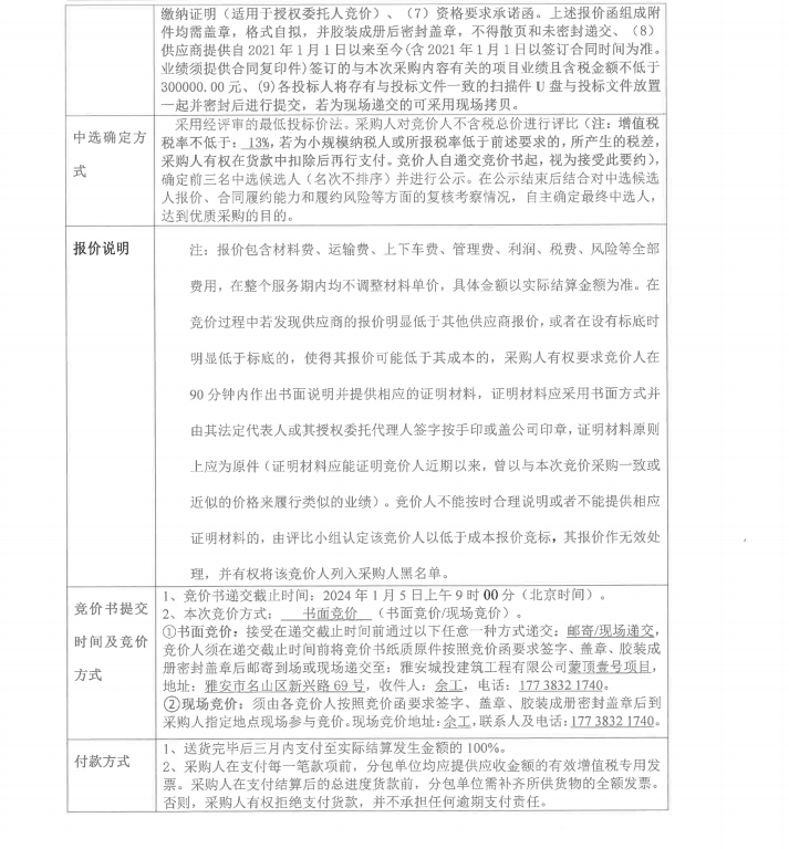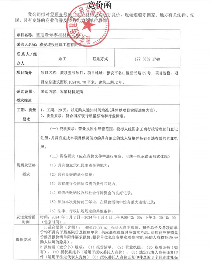 蒙頂壹號(hào)零星材料采購競(jìng)價(jià)公告