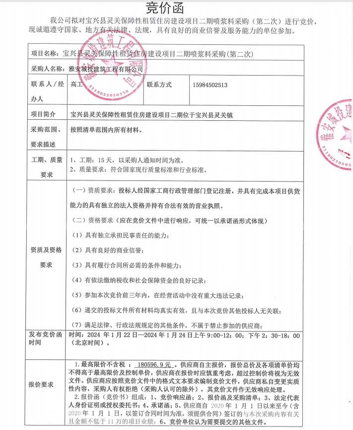 寶興縣靈關保障性租賃住房建設項目二期噴漿料采購(第二次)競價公告
