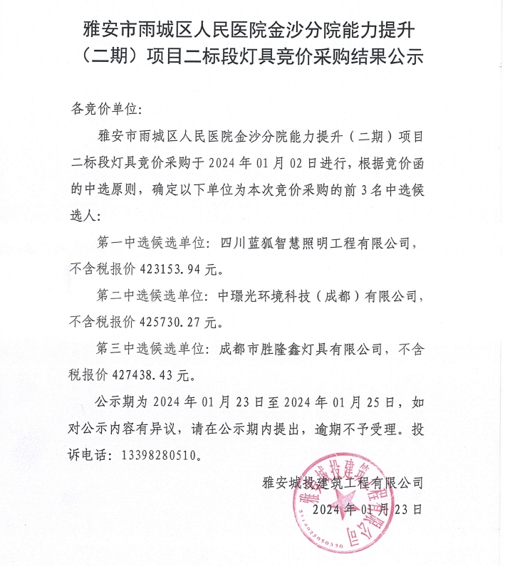 雅安市雨城區(qū)人民醫(yī)院金沙分院能力提升(二期)項(xiàng)目二標(biāo)段燈具競價(jià)采購結(jié)果公示