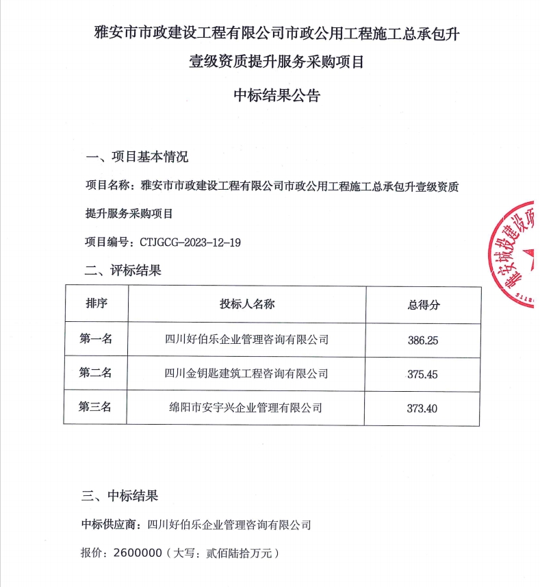 雅安市市政建設(shè)工程有限公司市政公用工程施工總承包升壹級資質(zhì)提升服務(wù)采購項目中標結(jié)果公告