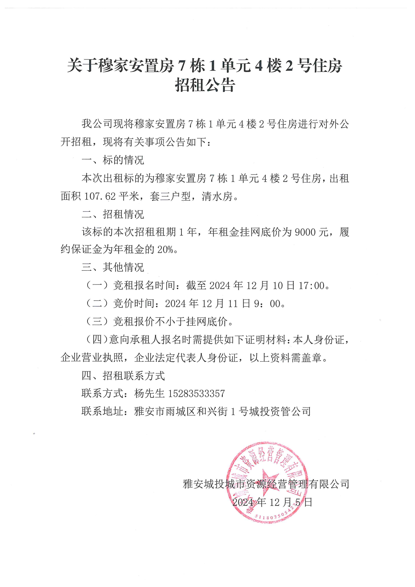 關(guān)于穆家安置房7棟1單元4樓2號(hào)住房招租公告
