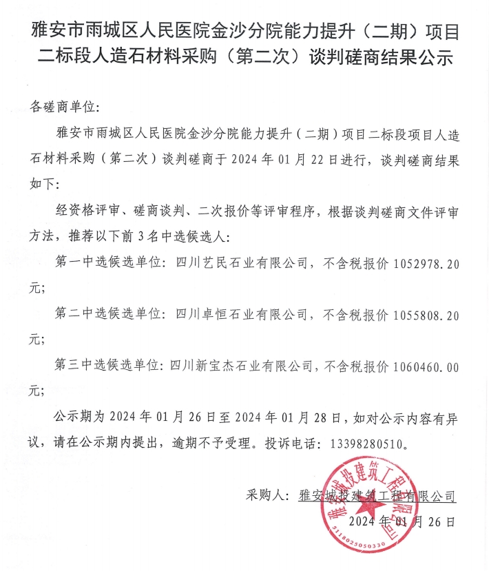 雅安市雨城區(qū)人民醫(yī)院金沙分院能力提升(二期)項目二標(biāo)段人造石材料采購(第二次)談判磋商結(jié)果公示