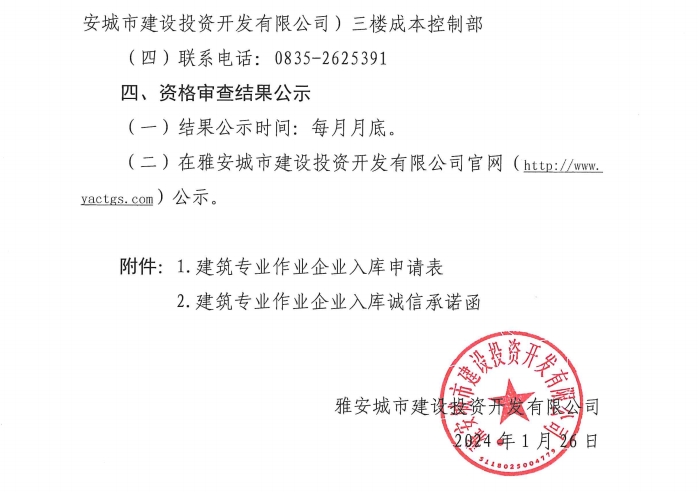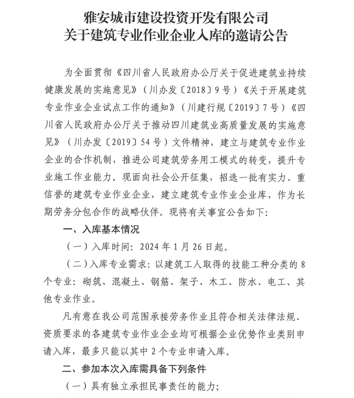 雅安城市建設(shè)投資開發(fā)有限公司關(guān)于建筑專業(yè)作業(yè)企業(yè)入庫(kù)的邀請(qǐng)公告