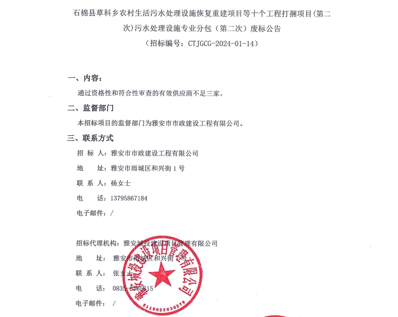 石棉縣草科鄉(xiāng)農(nóng)村生活污水處理設(shè)施恢復(fù)重建項(xiàng)目等十個(gè)工程打捆項(xiàng)目(第二次)污水處理設(shè)施專業(yè)分包(第二次)廢標(biāo)公告