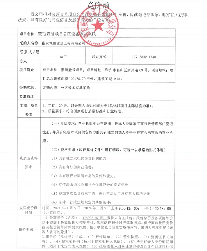 蒙頂壹號項目公區(qū)設(shè)備家具采購競價公告