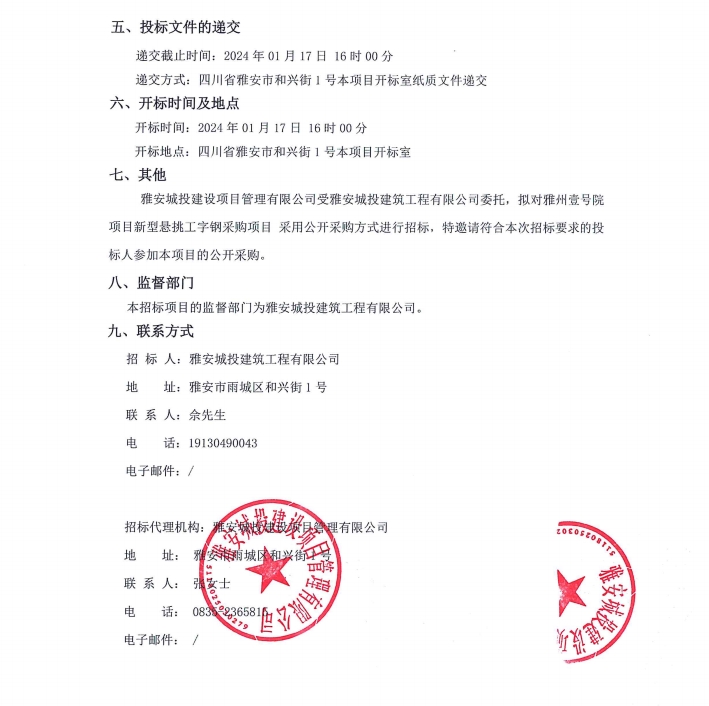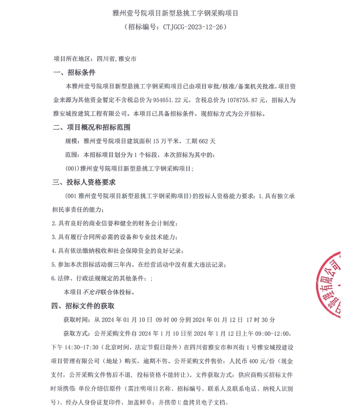 雅州壹號院項(xiàng)目新型懸挑工字鋼采購項(xiàng)目公告