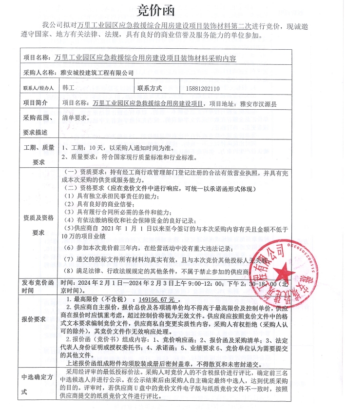 萬(wàn)里工業(yè)園區(qū)應(yīng)急救援綜合用房建設(shè)項(xiàng)目裝飾材料采購(gòu)(第二次)競(jìng)價(jià)公告