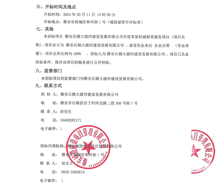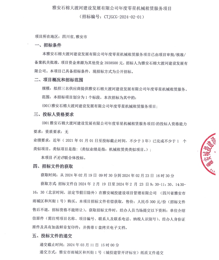 雅安石棉大渡河建設(shè)發(fā)展有限公司年度零星機械租賃服務(wù)項目公告