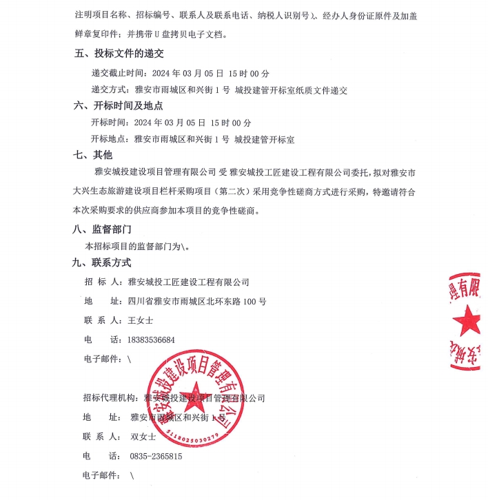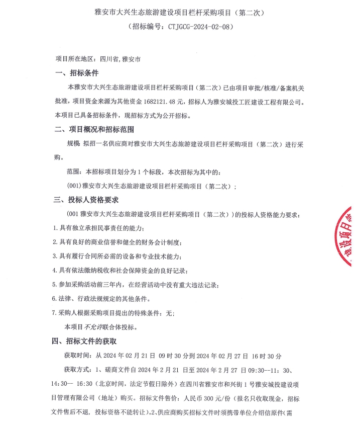 雅安市大興生態(tài)旅游建設項目欄桿采購項目(第二次)公告