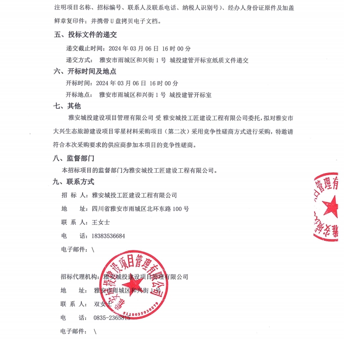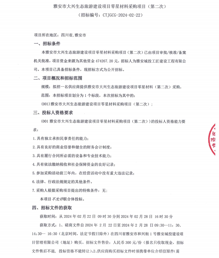 雅安市大興生態(tài)旅游建設(shè)項目零星材料采購項目(第二次)公告
