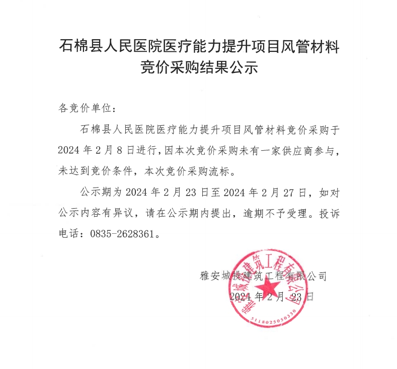 石棉縣人民醫(yī)院醫(yī)療能力提升項目風管材料競價采購結果公示