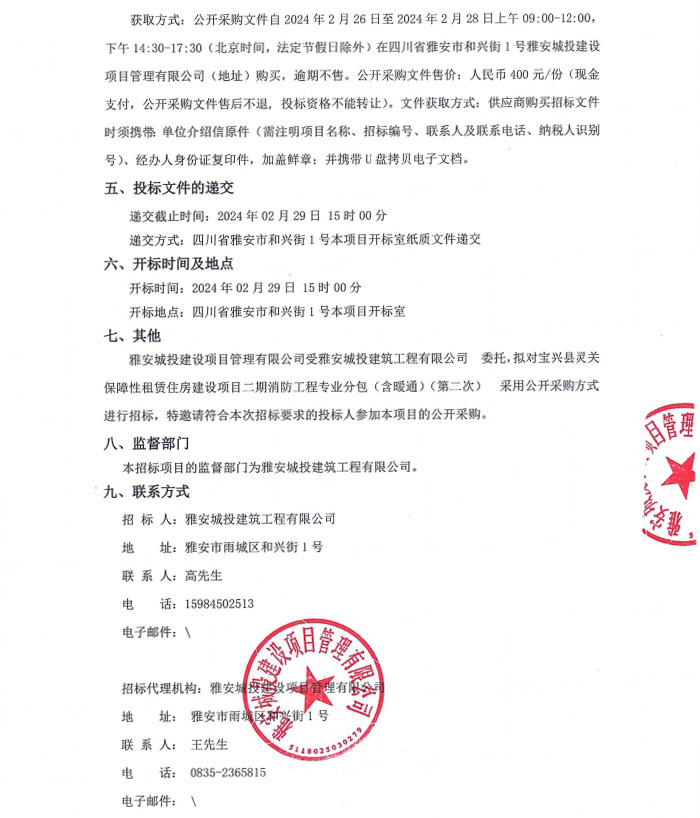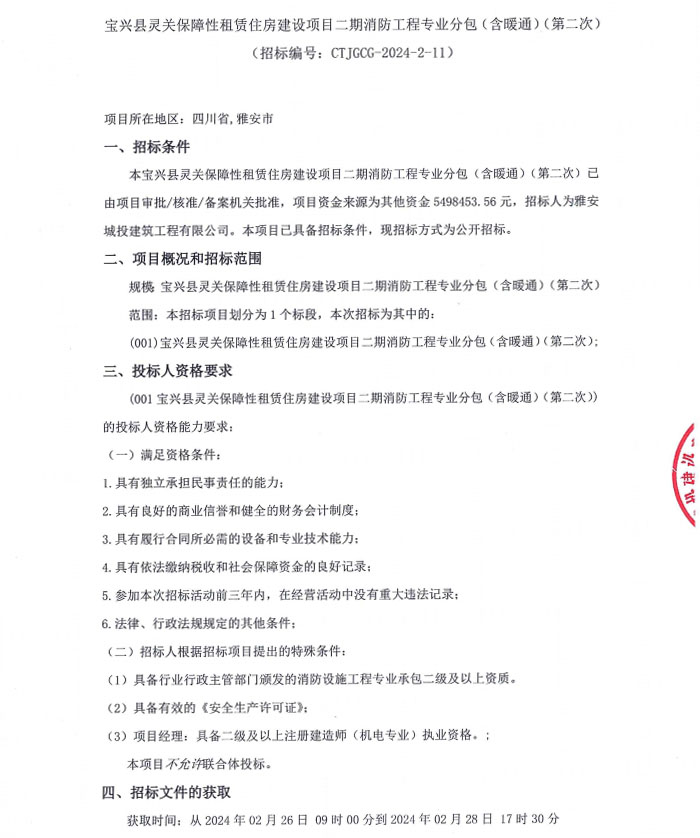 寶興縣靈關保障性租賃住房建設項目二期消防工程專業(yè)分包(含暖通)(第二次)公告