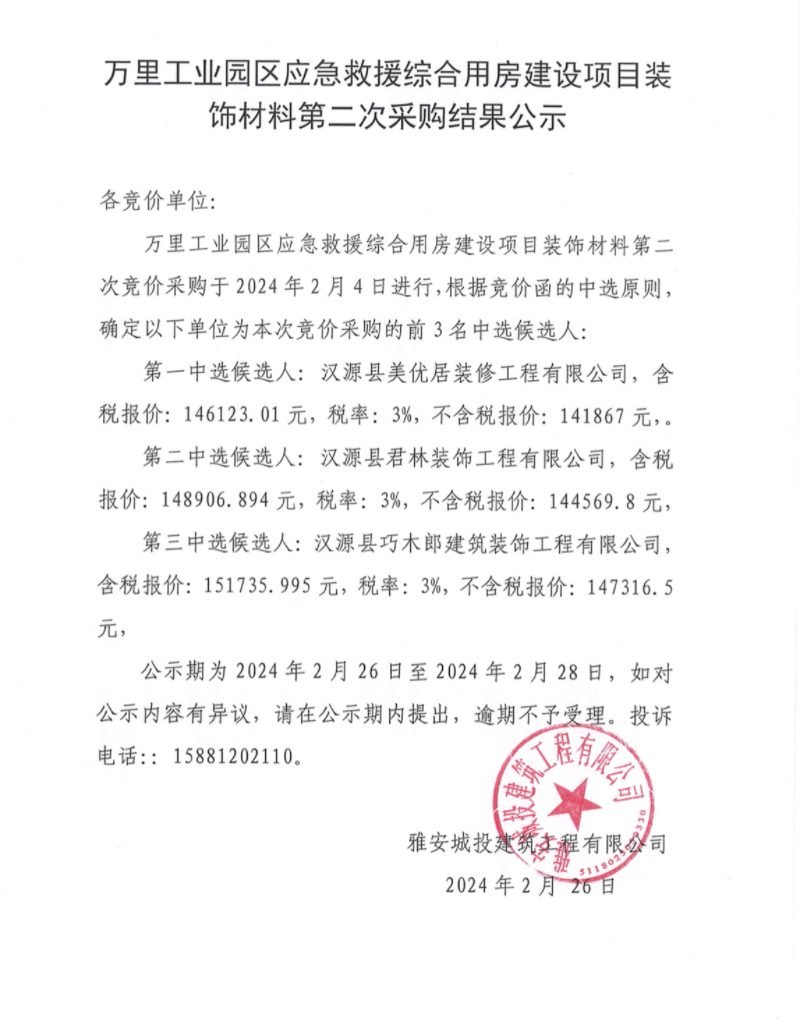 萬(wàn)里工業(yè)園區(qū)應(yīng)急救援綜合用房建設(shè)項(xiàng)目裝飾材料第二次采購(gòu)結(jié)果公示