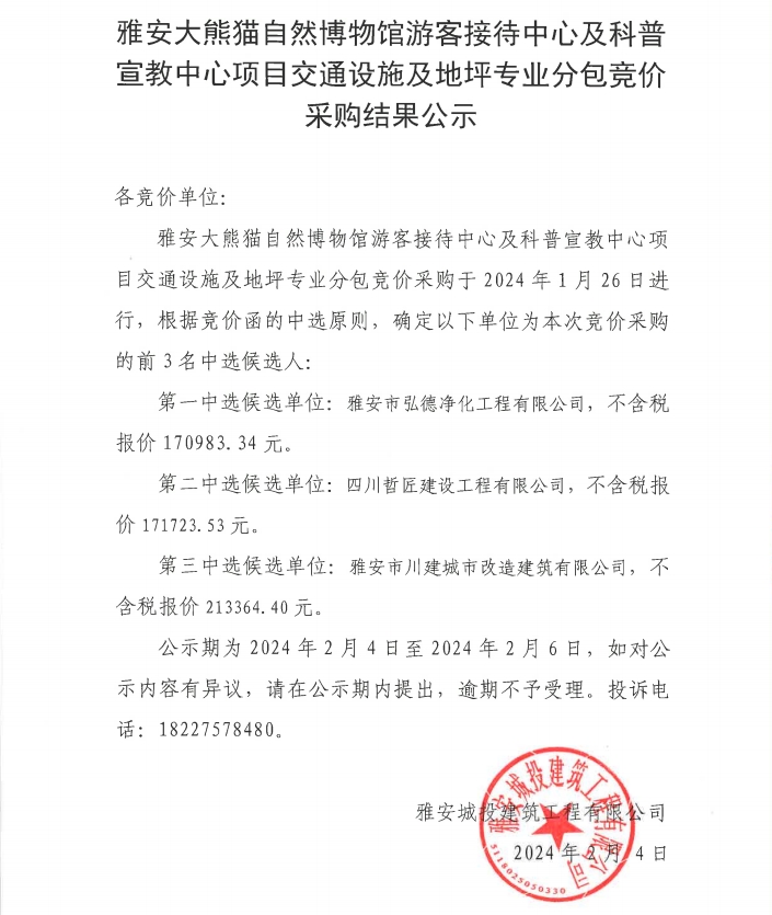 雅安市大熊貓自然博物館游客接待中心及科普宣教中心項(xiàng)目交通設(shè)施及地坪專業(yè)分包競(jìng)價(jià)采購(gòu)結(jié)果公示