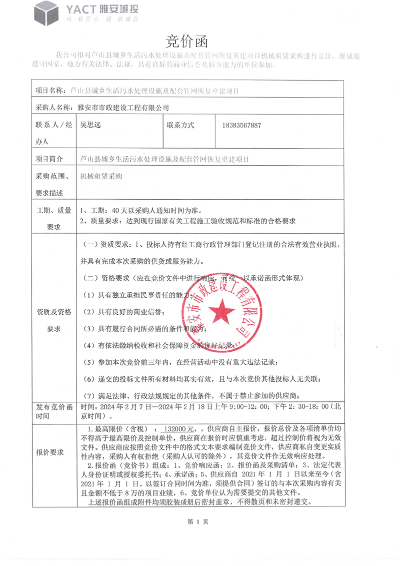 蘆山縣城鄉(xiāng)垃圾處理設(shè)施及配套管網(wǎng)恢復(fù)重建項(xiàng)目機(jī)械租賃采購競價(jià)函
