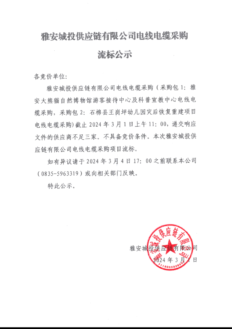 雅安城投供應(yīng)鏈有限公司電線電纜采購流標(biāo)公示