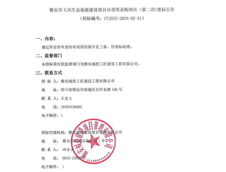 雅安市大興生態(tài)旅游建設(shè)項目吊頂?shù)炔少忢椖浚ǖ诙危⿵U標(biāo)公告