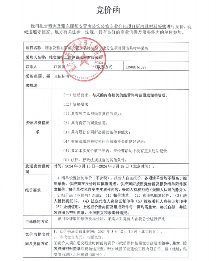 穆家及雅東麗都安置房裝飾裝修專業(yè)分包項(xiàng)目廚潔具材料采購(gòu)競(jìng)價(jià)公告