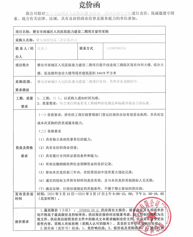 雅安市雨城區(qū)人民醫(yī)院能力建設(shè)二期項(xiàng)目窗簾采購(gòu)競(jìng)價(jià)公告