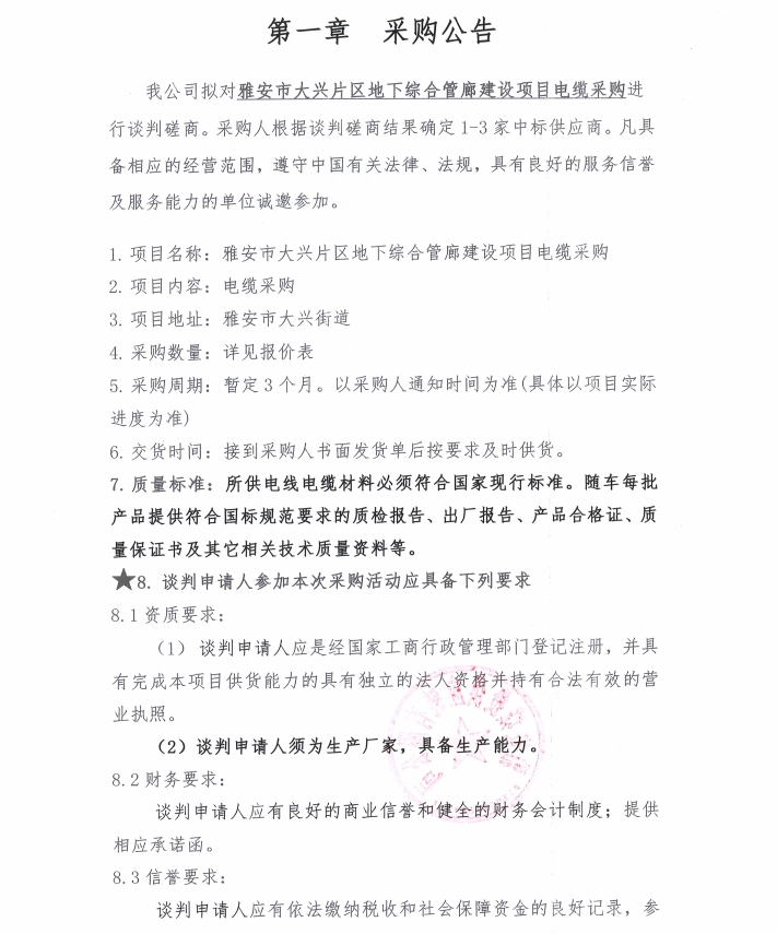 雅安市大興片區(qū)地下綜合管廊建設(shè)項(xiàng)目電纜采購(gòu)公告