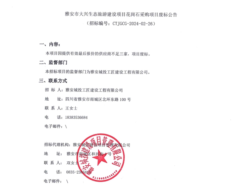 雅安市大興生態(tài)旅游建設項目花崗石采購項目廢標公告