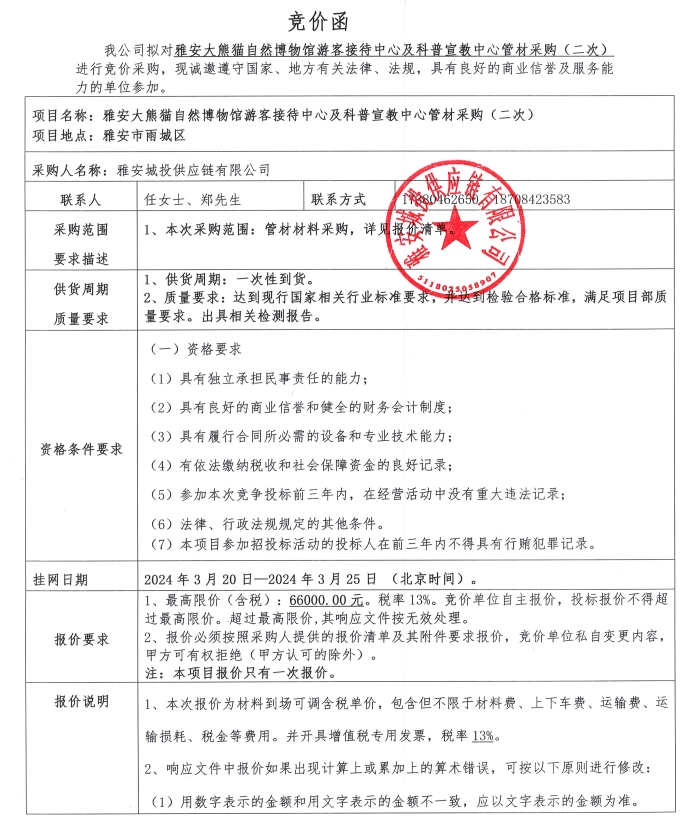 雅安大熊貓自然博物館游客接待中心及科普宣教中心管材采購(gòu)(二次)競(jìng)價(jià)公告