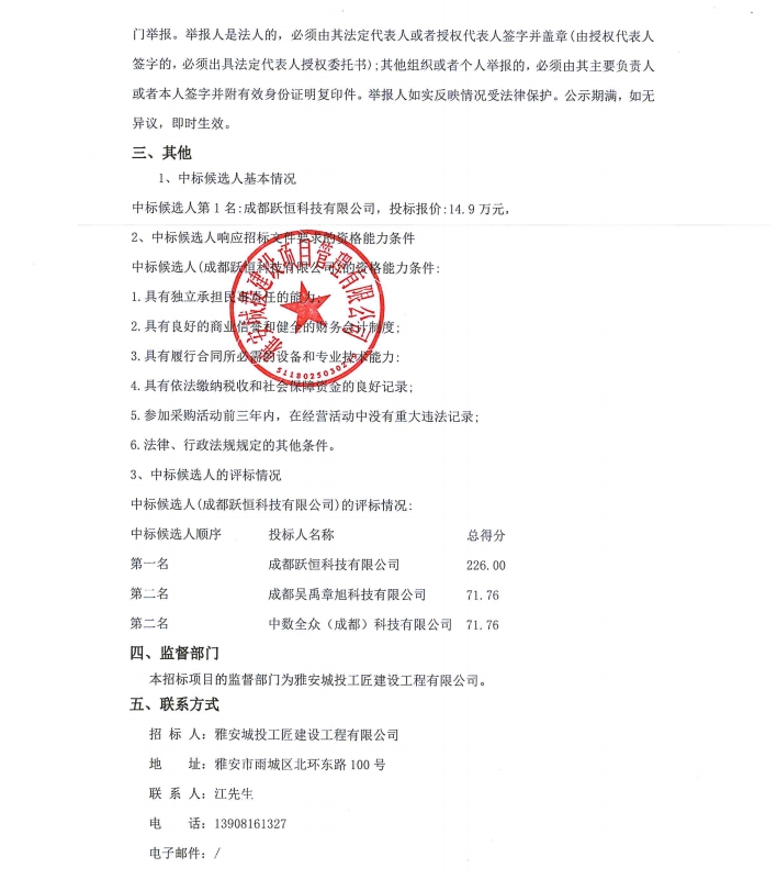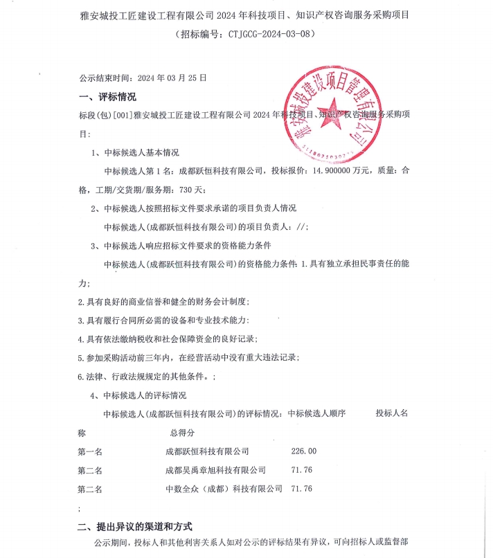 雅安城投工匠建設(shè)工程有限公司2024年科技項(xiàng)目、知識(shí)產(chǎn)權(quán)咨詢(xún)服務(wù)采購(gòu)項(xiàng)目公示