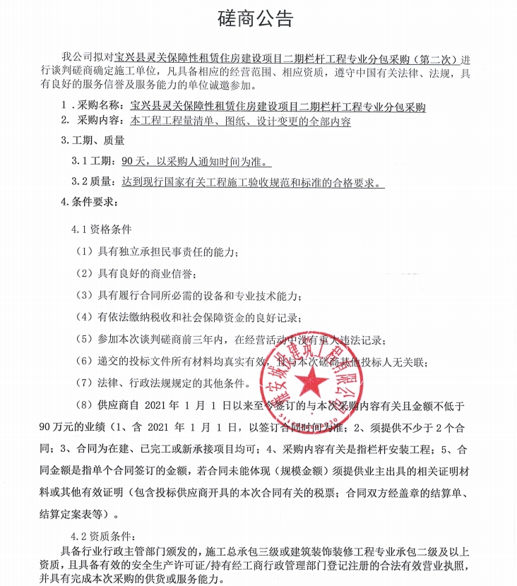 寶興縣靈關(guān)保障性租賃住房建設(shè)項(xiàng)目二期欄桿工程專業(yè)分包采購(gòu)(第二次)磋商公告