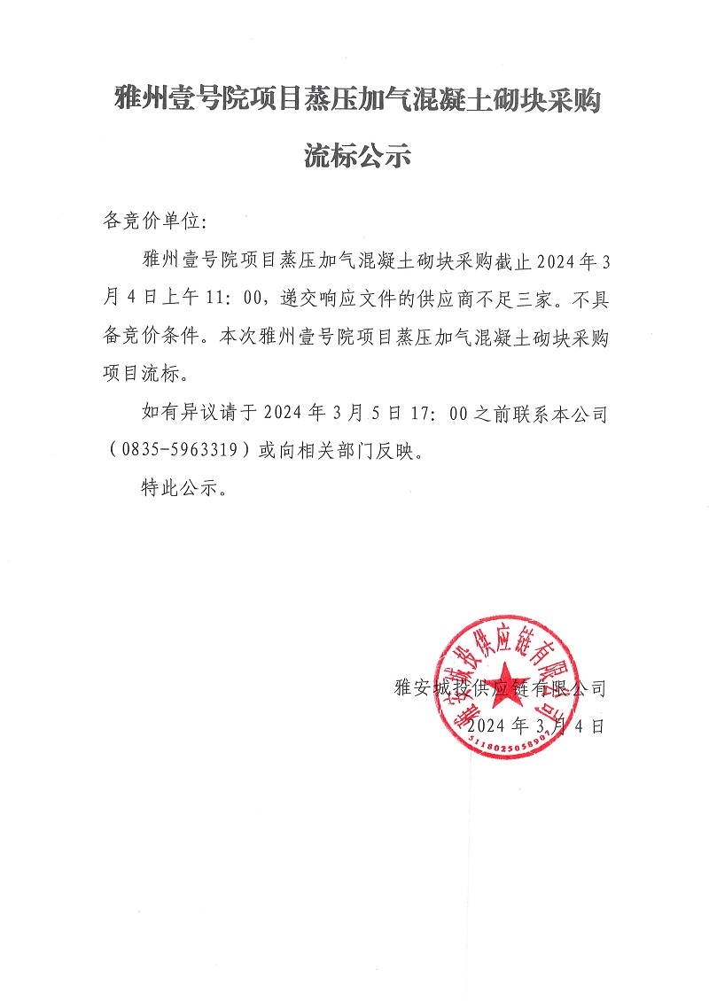 雅州壹號院項目蒸壓加氣混凝土砌塊采購流標(biāo)公示