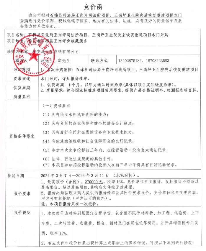 附件1:競價函-石棉縣司法局王崗坪司法所項目、王崗坪衛(wèi)生院災(zāi)后恢復重建項目木門材料采購