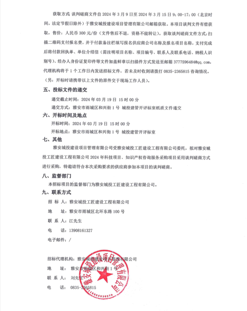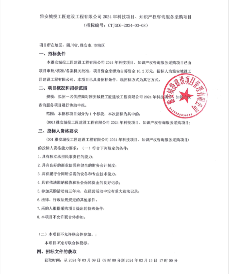 雅安城投工匠建設(shè)工程有限公司2024年科技項(xiàng)目、知識(shí)產(chǎn)權(quán)咨詢服務(wù)采購(gòu)項(xiàng)目