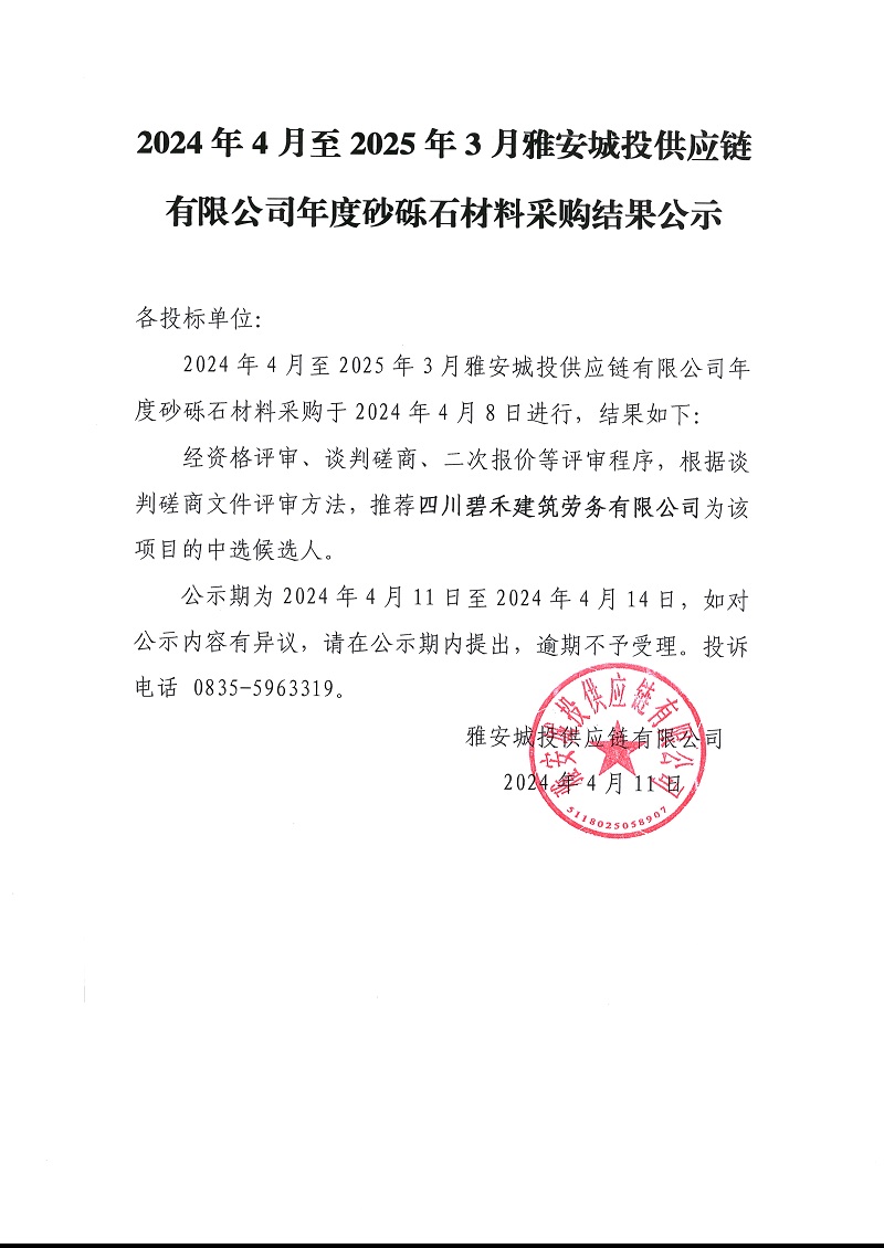 2024年4月至2025年3月雅安城投供應(yīng)鏈有限公司年度砂礫石材料采購(gòu)結(jié)果公示