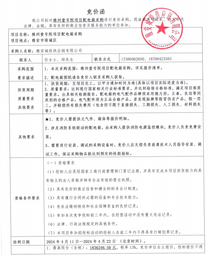雅州壹號(hào)院項(xiàng)目配電箱采購競(jìng)價(jià)公告