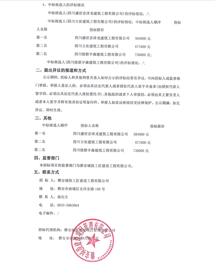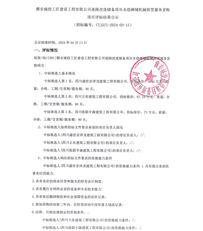 雅安城投工匠建設(shè)工程有限公司道路改造儲備項目水穩(wěn)攤鋪機械租賃服務采購項目評標結(jié)果公示