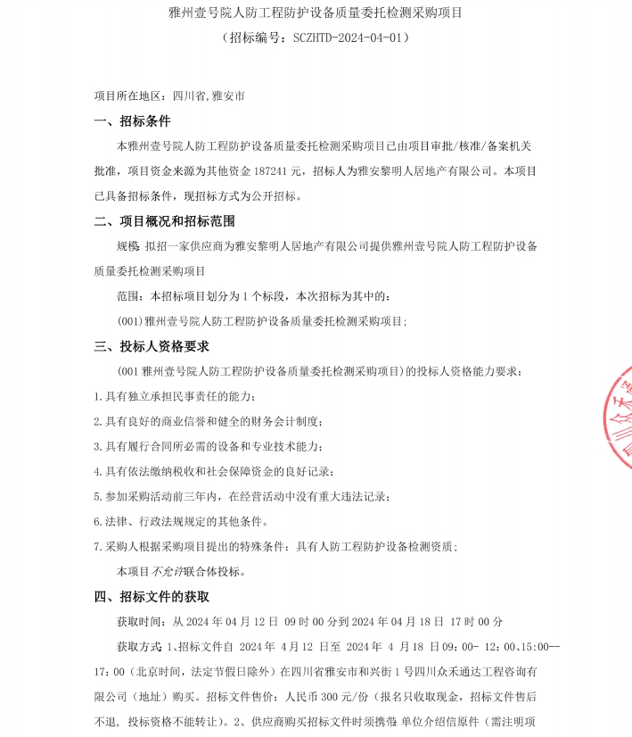雅州壹號院人防工程防護設(shè)備質(zhì)量委托檢測采購項目公告