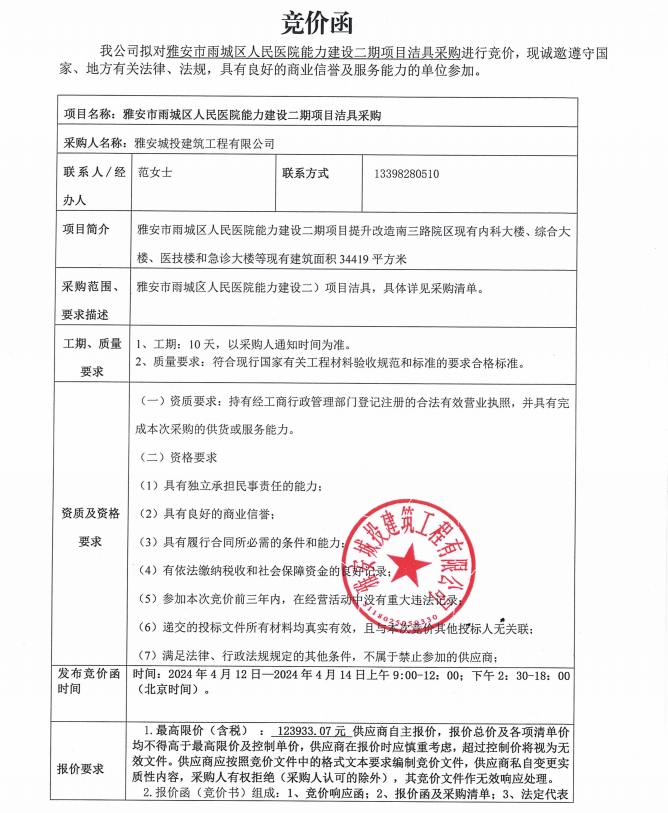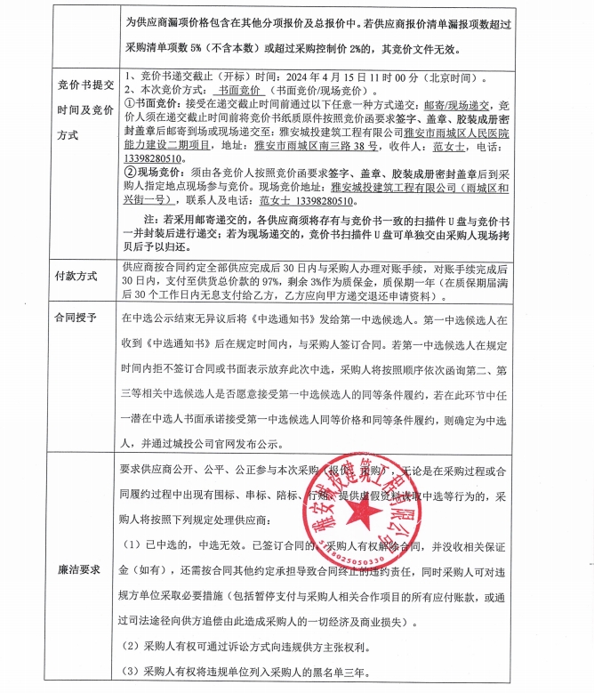 雅安市雨城區(qū)人民醫(yī)院能力建設(shè)二期項目潔具采購競價公告