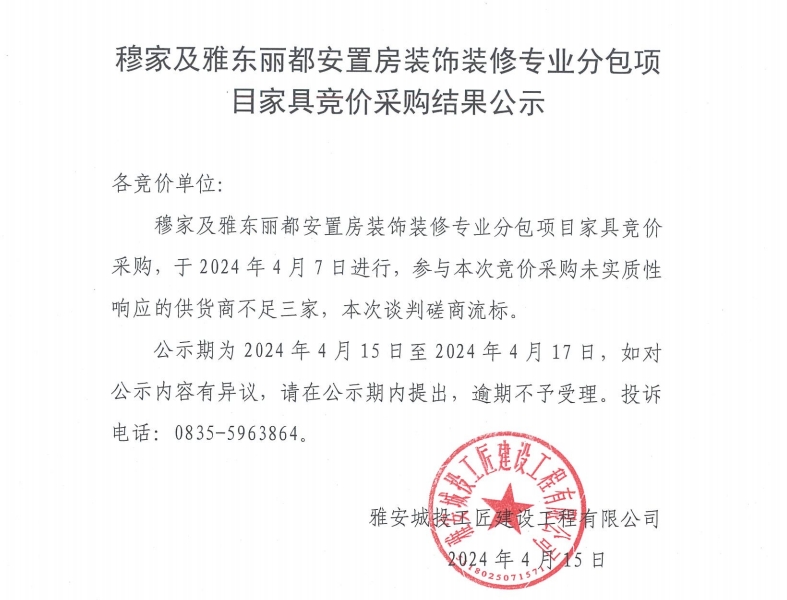 穆家及雅東麗都安置房裝飾裝修專業(yè)分包項目家具競價采購結(jié)果公示